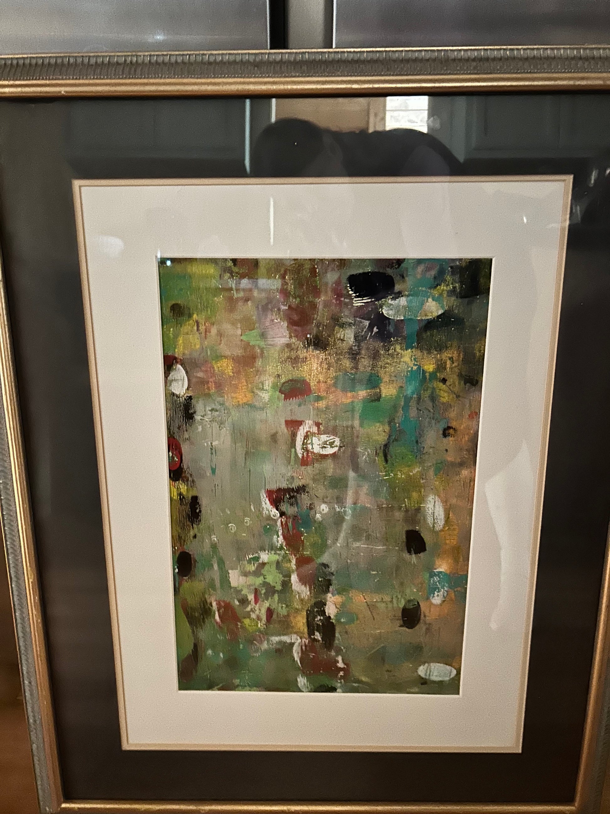 Abstract with a lot of color, lots of excitement; acrylic painting on paper. Black frame.